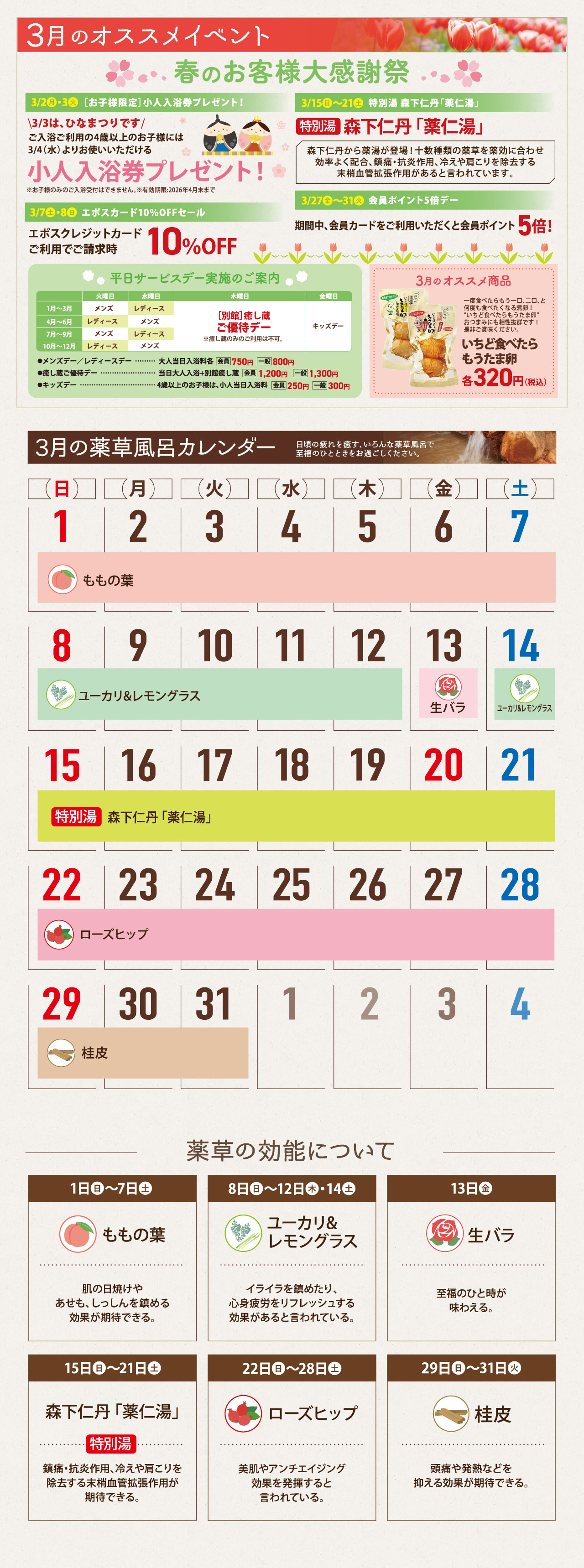 | 2026/02/22 | イベント情報 2(フ)6(ロ)の日ポカポカ薬草風呂 特別湯 健美薬湯「燃-ねん-」 |