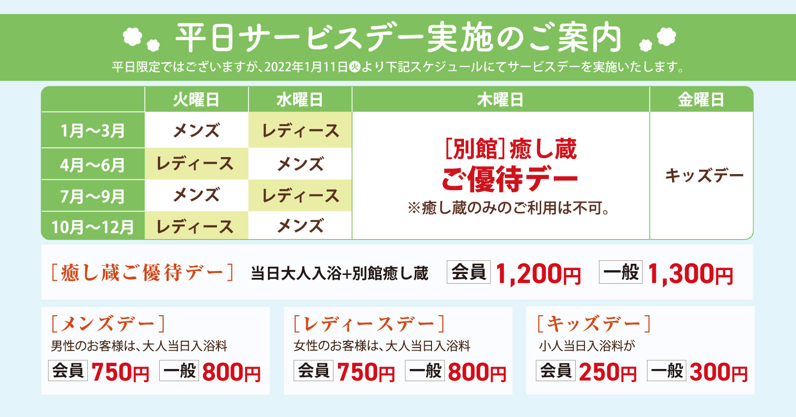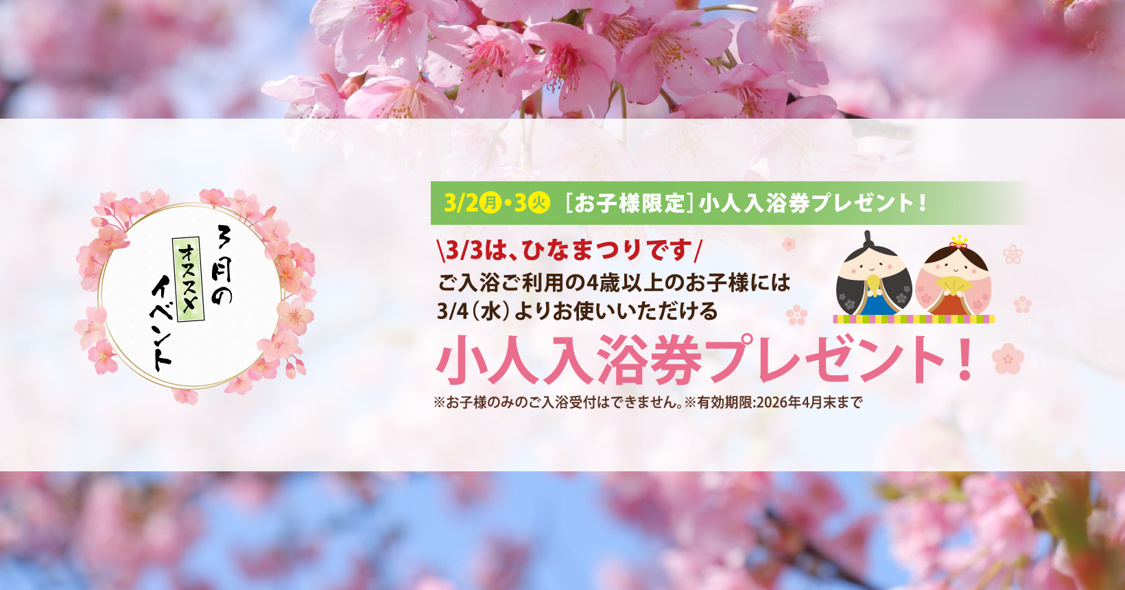 | 2026/03/02 | イベント情報 [お子様限定]小人入浴券プレゼント! |